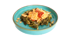 Orecchiette with garlic, oil, chili peppers, tomatoes, turnip tops and taralli