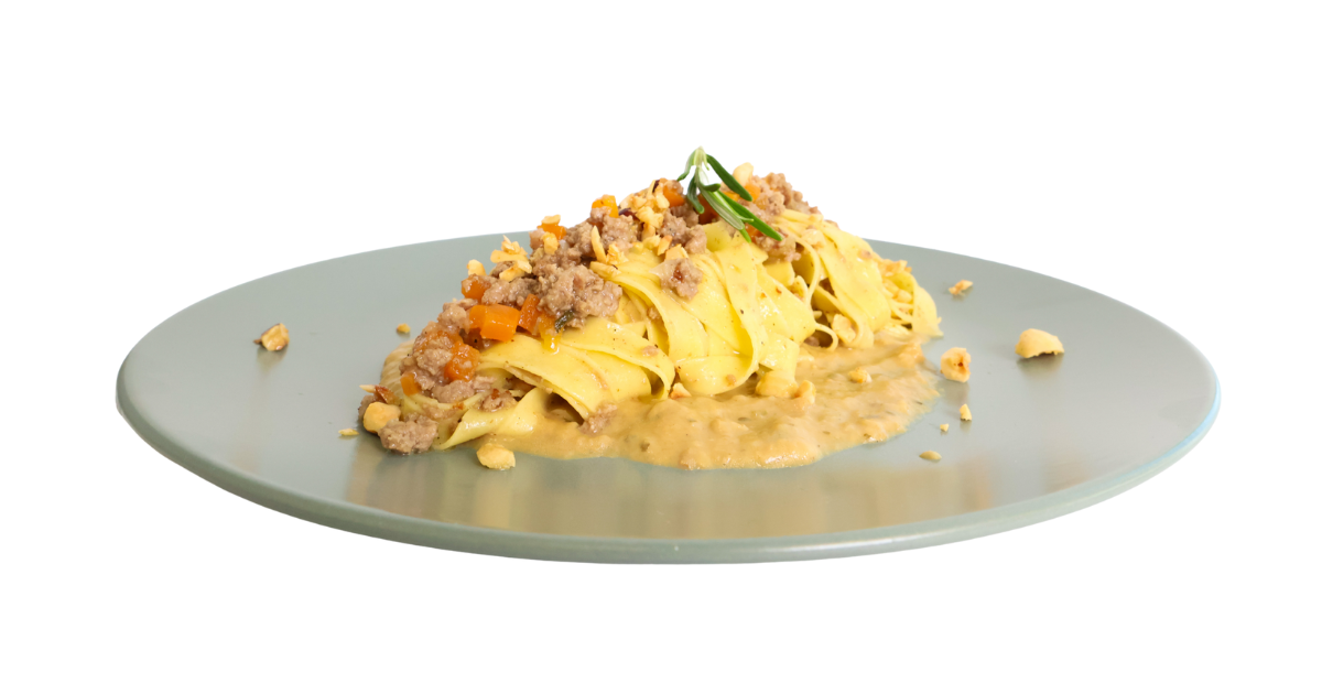 TAGLIATELLE CON CREMA DI FUNGHI PORCINI, RAGÙ E NOCCIOLE