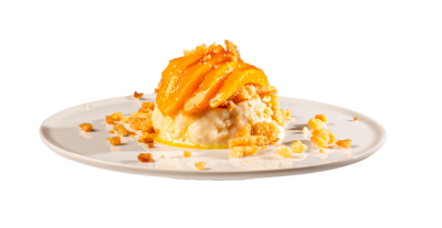 Creme caramel con mango sciroppato e crumble salato
