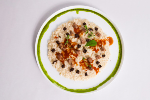 Riso Carnaroli mantecato al taleggio di capra, bottoni di tartufo bianco e pinoli tostati