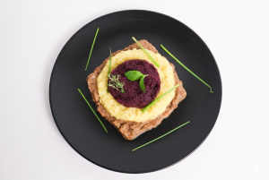 Tortino di verza ripieno di riso nero al cavolo rosso e zenzero